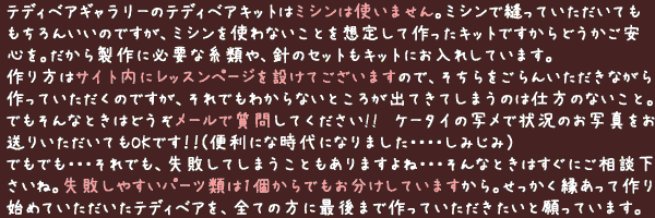 「この画像のキットが欲しいんだけど、どのページにあるのかわからない。」「このベアキットの耳だけ白にしてもらうことは出来ますか?」などキットの在庫やカスタマイズのご相談、お値段のお問い合わせ等はどうぞメールでお問い合わせ下さいませ。)遠慮無くメールでご質問下さいませ。お問い合わせボタン