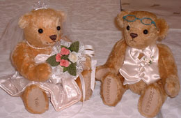 (コメント)無事に完成させ、式に間に合いました。オリジナル製を出すために、メガネを手作りしました。あとホクロつけちゃいました。お互いに作成したベアは宝物です。あと、一緒に作ったことで、素敵な思い出になりました。