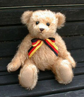 (コメント) 実はやっとこさベアが完成しました!! バイトや学業の合間を見つけてはちょこちょこやっていました。 実際やってみると、けっこう大変でした。失敗も多々ありました。 例えば、大きな失敗は2点ありました。 失敗1 パターンをモヘア地にマジックで移す作業のとき、強く写したためインクが生地の表にまで染み込んでしまい、頭を作る段階で毛をカットしていたら生地の縫い目に黒いインクが!!染み出していました。写真ではわかりづらいですが、顔という大事な部分に黒い部分ができてしまい、刺しゅうをしてごまかしています。(笑) 失敗2 わたを詰め終わり、全体のバランスを良くするため、「ドイツのベア職人はこういうことをして、ベアの見た目を良くするのだ。」とかなんとか適当なことを言って、スタッフィングスティックをトンカチのように見立ててとんとんとベアを叩いていたら、案の定グラスアイを叩いてしまい!?まっぷたつに割れてしまいました。とほほ...その後、家から一番近い浦和のユザワヤさんに行って、おばちゃんやお姉さんの視線を気にしつつ、グラスアイを買ってきました。写真ではわかりづらいと思いますが、向かって左の目がちょっと違います。 それでも懲りず、「これはこれで味があって良いのだ。」とかいっています。(笑)