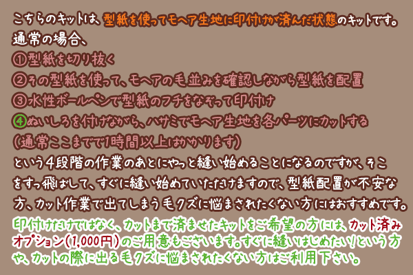 日本のモヘアで作るテディベアキット (印付け済キット) 各1セット(ベア1体分)本体価格 9,980円 ※カット済みオプションご希望の場合は別途1,000円で承ります。 モヘアのキットにお入れしている糸についての大切なお知らせはこちらから(ご注文の前に必ずお読み下さい) |